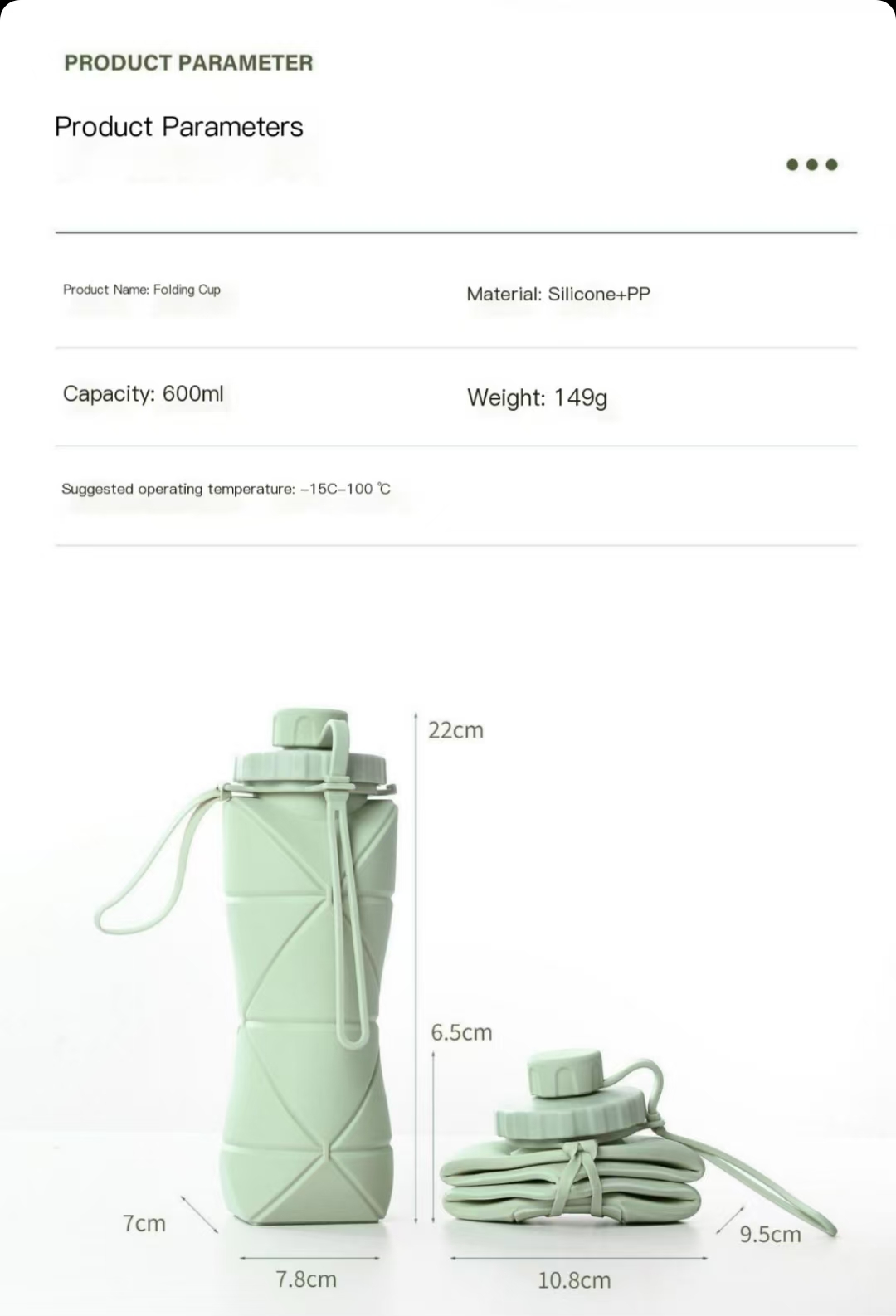 Product Name: Folding CupMaterial: Silicone PPCapacity: 600mlWeight: 149gRecommended Temperature: -15 degrees to 100 degrees Note: Minimum order of 10 pieces