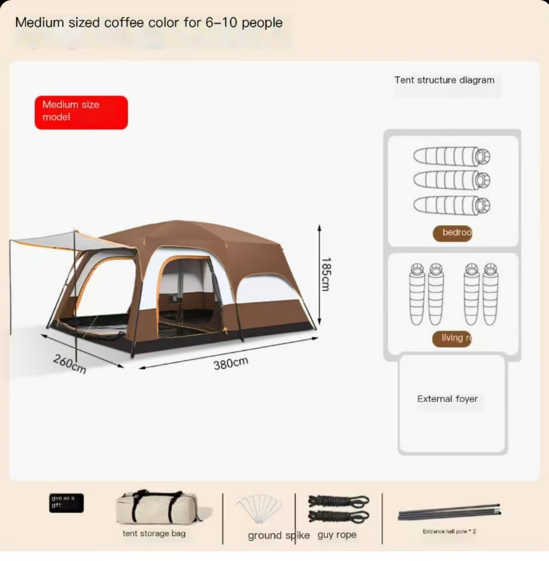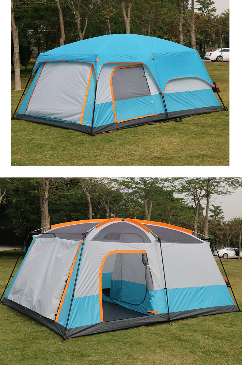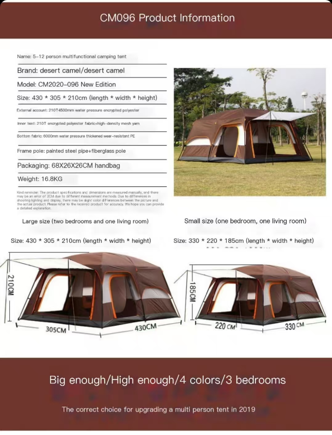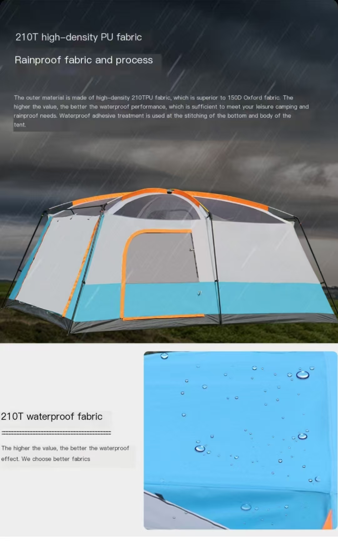 Tent Structure: Double-layer tent Outer Tent Material: Oxford cloth Tent Bottom Material: PE Pole Material: Painted steel tube, Fiberglass pole Outer Tent Waterproof Rating: Greater than 3000mm Tent Bottom Waterproof Rating: 3000mm Inner Tent Material: 210T high-density waterproof Oxford cloth 4500mm Suitable Seasons: Four-season tent Tent Dimensions When Unfolded: 430*305*210CM Colors: Khaki, Dark Green, Coffee, Orange, Sky Blue Weight: 16kg