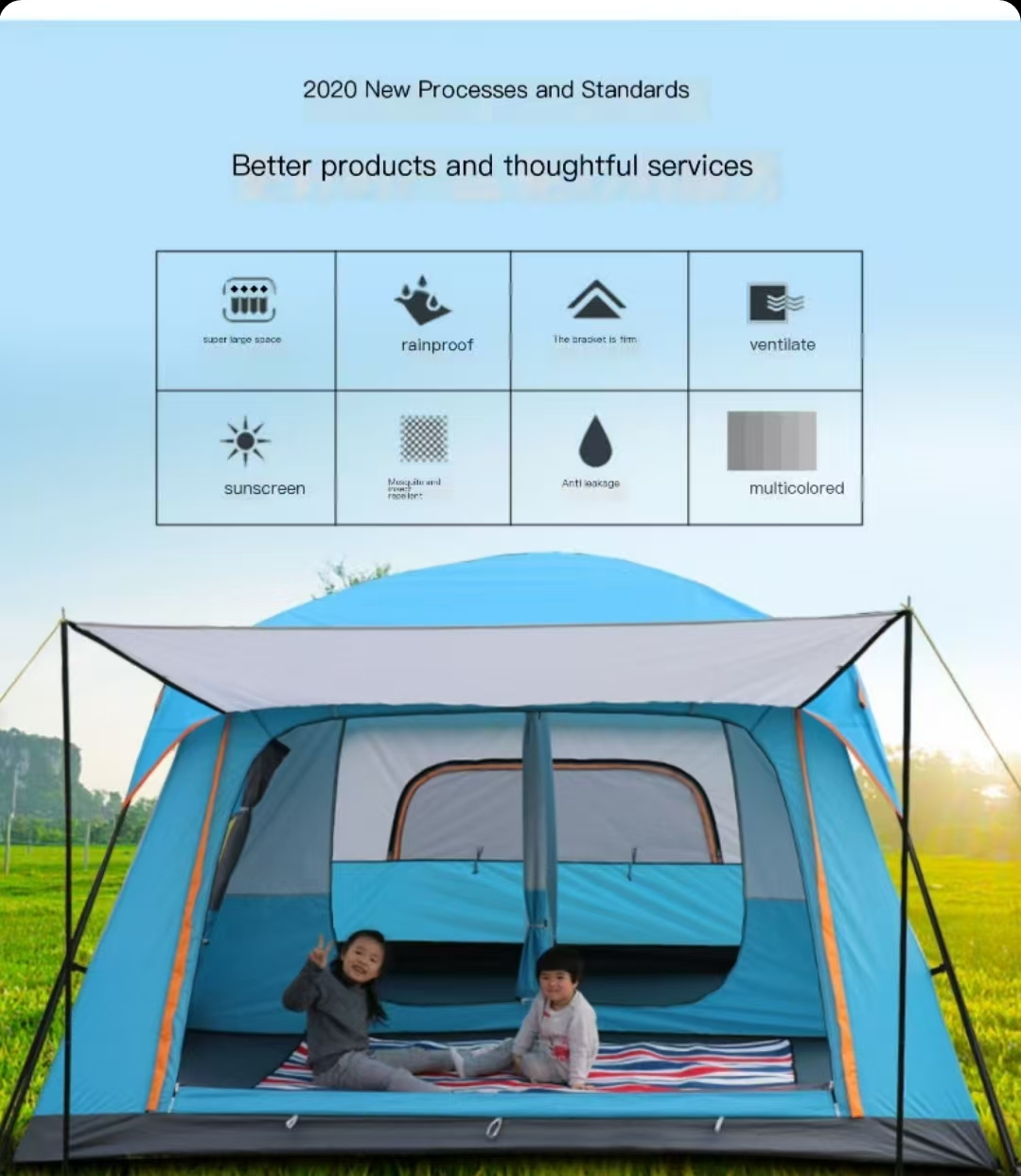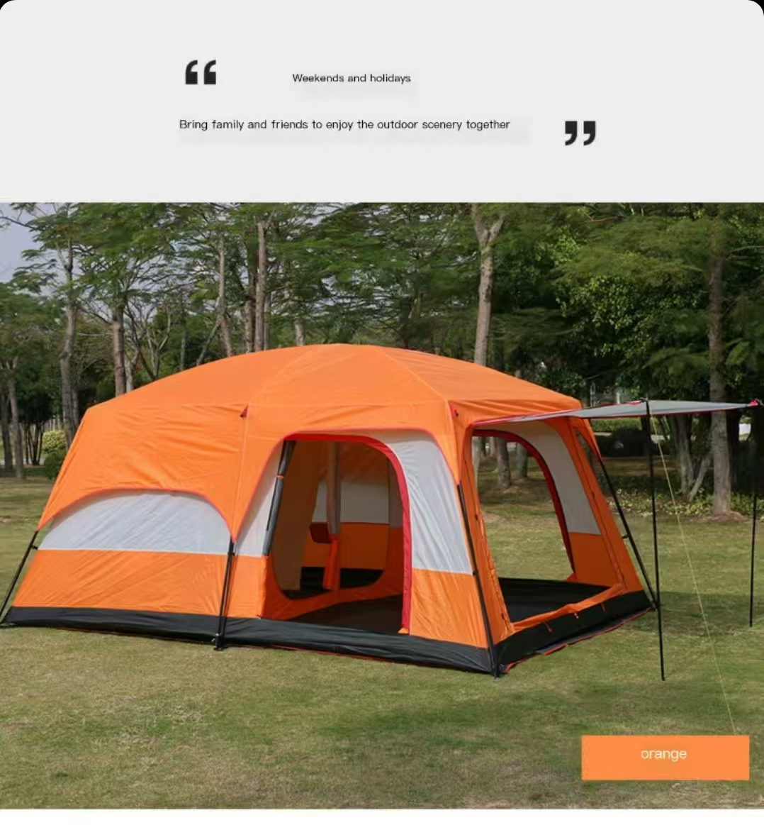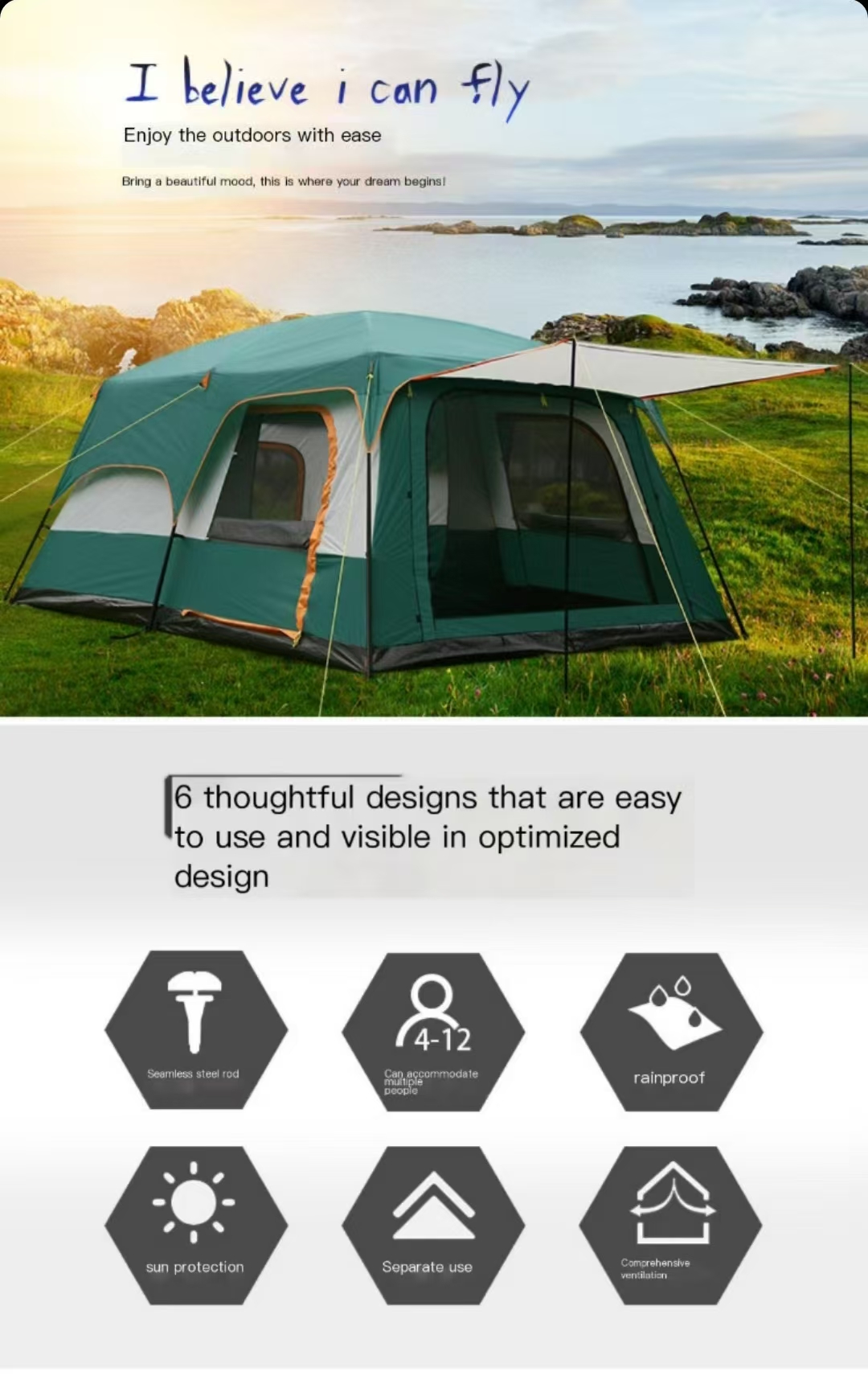 This outdoor camping tent features a spacious design, comfortably accommodating multiple people. Its portable folding structure makes storage easy and travel hassle-free. Made with high-quality fabric, it offers strong sun protection and efficient rain resistance, handling variable weather conditions. Quick to set up and well-ventilated, it is suitable for camping, hiking, park picnics, and various outdoor activities, making it an ideal gear for outdoor adventures.